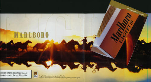 General promotional direct mail for Marlboro Lights, featuring an image of cowboys and their horses during sunset. Piece uses golden color symbolic of Marlboro Lights. Also comes with 6 coupons for Marlboro cigarettes.