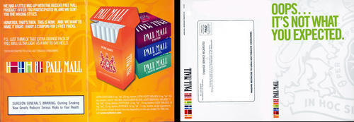 Direct mail from Pall Mall with a coupon for 2 free packs of Pall Mall, sent as compensation for a mix up in a previous mailing order, where a style of Pall Mall other than the one ordered was sent to the receiver. Cover Text: Oops...It's not what you expected." Inside Text: "We had a little mix-up with the recent Pall Mall product offer you participated in, and we sent you the wrong styles. However, that's then. This is now. And, we want to make it right. Enjoy a coupon for 2 free packs."