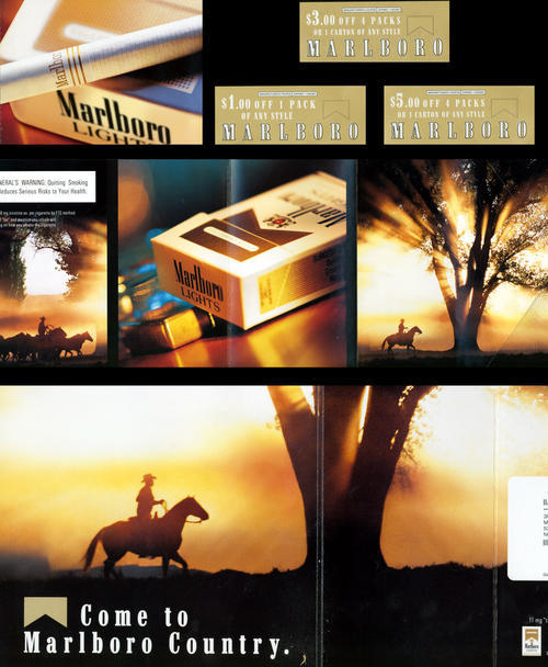 General direct mail from Marlboro in promotion of Marlboro Lights. Piece includes image of cowboy on horse and golden yellow lighting and coloring. Three coupons also included.