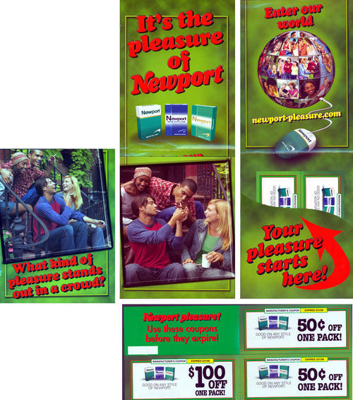 Direct mail from Newport, inviting receivers to visit the brand's website. Also comes with 3 cigarette pack coupons. Text: "What kind of pleasure stands out in a crowd? It's the pleasure of Newport. Enter our world newport-pleasure.com