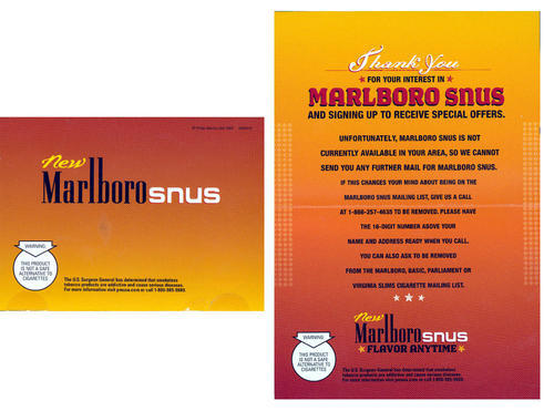 Direct mail from Marlboro Snus thanking receiver for signing up. Piece informs receiver, however, that receiver will not get any more direct mail from the brand because Marlboro Snus is currently unavailable in receiver's area. Received in November 2007.