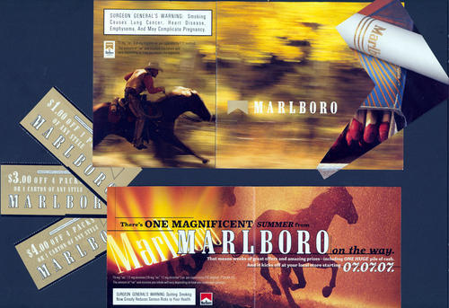 General direct mail promotion for Marlboro Lights featuring images of a cowboy and horse with golden lighting and coloring. 6 coupons included.