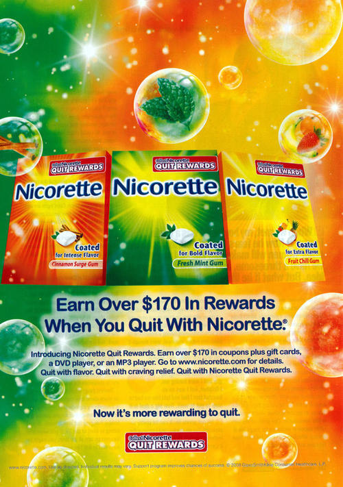 Ad for flavored varieties of Nicorette stop smoking gum: Cinnamon Surge, Fresh Mint, and Fruit Chill. Also promotes brand reward program. "Earn Over $170 In Rewards When You Quit With Nicorette."