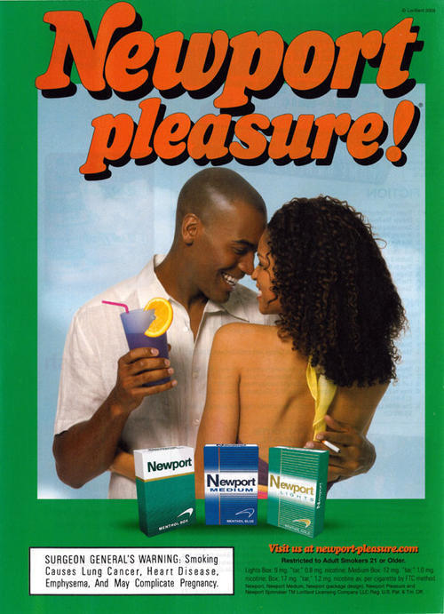 Newport ad featuring an image of an African American couple laughing and holding each other. The man holds a drink in one hand and a cigarette in the other.