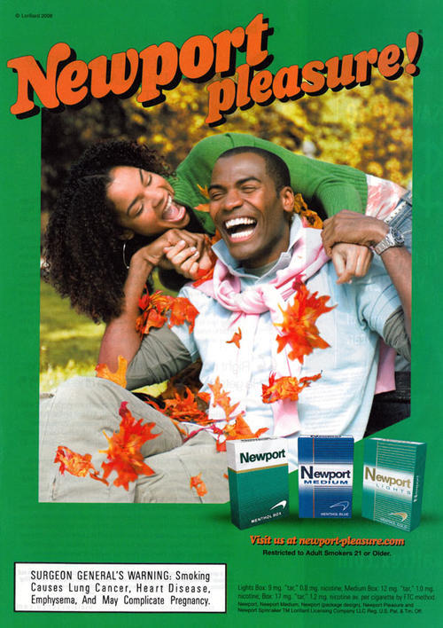 Fall themed ad for Newport cigarettes, featuring an image of an African American couple holding each other outside and laughing together. Autumn colored leaves fall around them.