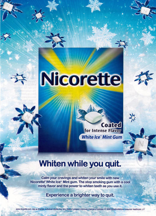 Cool, winter ice themed ad for Nicorette stop smoking gum in White Ice Mint flavor. Text: "Whiten while you quit. Calm your cravings and whiten your smile with new Nicorette White Ice Mint gum. The stop smoking gum with a cool minty flavor and the power to whiten teeth as you use it. Experience a brighter way to quit."