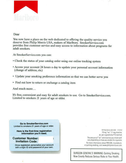 Direct mail letter from Marlboro promoting the features available at the website www.smokerservice.com