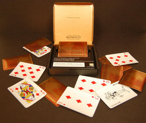 Direct mail piece in promotion of Marlboro Blend No. 27. Packaging and included free gift playing cards make use of the blend's copper color theme.