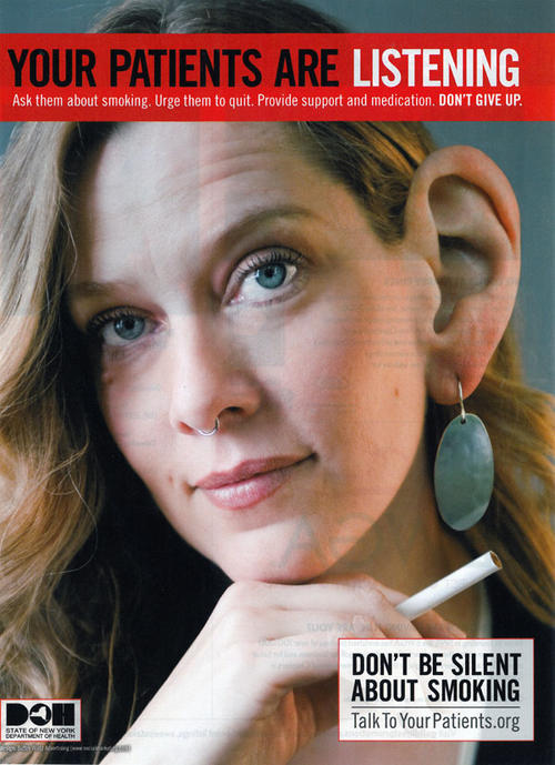 Advertisement by the New York Department of Health, featuring a close-up image of a smoker, and a message aimed at physicians. "Your patients are listening. Ask them about smoking. Urge them to quit. Provide support and medication. Don't give up." "Don't be silent about smoking. Talk To YourPatients.org"