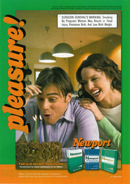 Ad for Newport cigarettes, featuring an image of a man getting ready to blow out candles on a cake, with a smiling woman looking over his shoulder.