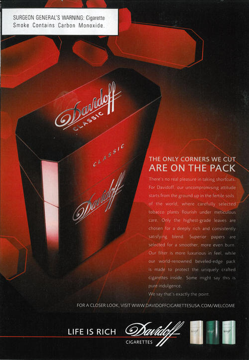 Text: "The only corners we cut are on the pack. There's no real pleasure in taking shortcuts. For Davidoff, our uncompromising attitude starts from the ground up in the fertile soils of the world, where carefully selected tobacco plants flourish under meticulous care. Only the highest grade leaves are chosen for a deeply rich and consistently satisfying blend. Superior papers are selected for a smoother, more even burn. Our filter is more luxurious in feel, while our world-renowned beveled-edge pack is made to protect the uniquely crafted cigarettes inside. Some might say this is pure indulgence. We say that's exactly the point."