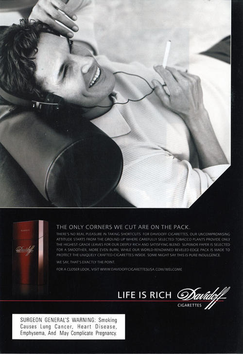 Ad from existing cigar brand, Davidoff, promoting new Davidoff cigarettes, presented in a uniquely shaped red pack. Features an image of a young man, reclining, smoking a cigarette and listening to music.