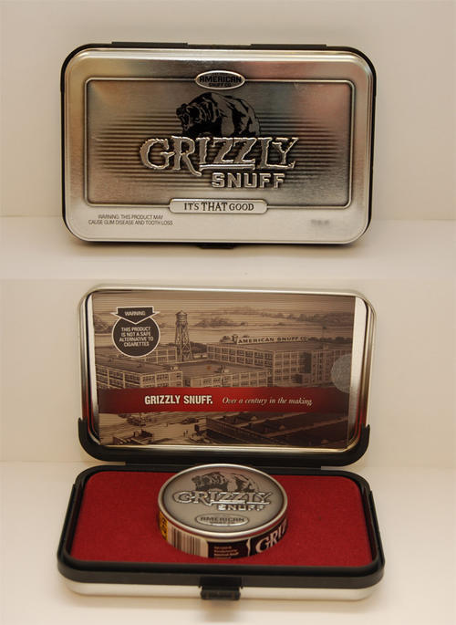 Grizzly branded tin with a can of Grizzly moist snuff included. Package comes with a small booklet promoting the Grizzly brand, and includes a $1.00 off a can coupon, and a post card to sign up for the Grizzly mailing list.