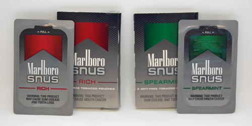 Packages of Marlboro Snus in Spearmint and Rich flavors. Each pack includes 6 snus pouches. Marlboro Snus is also available in Mild and Peppermint flavors.