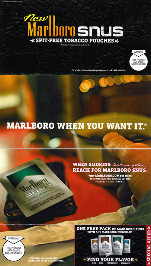 Direct mail in promotion of Marlboro Snus, featuring an image of the "Spearmint" style of the product. Text: "Marlboro when you want it. When smoking isn't an option, reach for Marlboro Snus. Visit Marlboro.com for more information and special offers." Piece comes with a coupon for one free pack of Marlboro Snus with any Marlboro purchase.