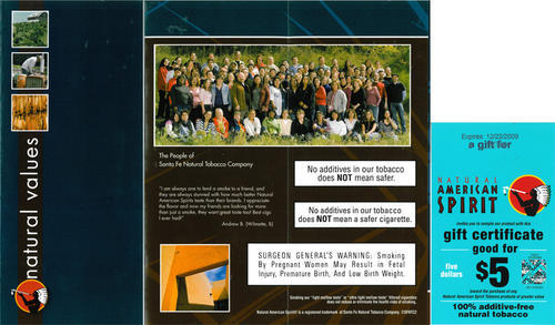 Direct mail piece from Natural American Spirit with a brochure describing the company's values, and a coupon for $5.00 off any purchase of Natural American Spirit products of greater value. The piece also came with a letter thanking the receiver for their interest in the brand.