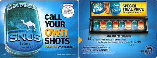 Direct mail piece received in March 2010 advertising frost flavored Camel Snus, and a price promotion for the products in the month of March. Text: "Call your own shots." "Boldly go everywhere." The back side of the piece includes a testimonial from a user, and directs the receiver to share their own experiences on Camel snus' brand website. Piece uses the slogan: "Break free".