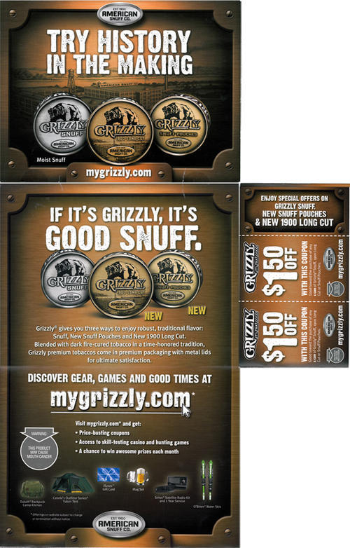 Direct mail from Grizzly received in April 2010, promoting new product styles (1900 Long Cut and Snuff Pouches) and the brand's website (mygrizzly.com), where users can play games, enter a sweepstakes and download coupons. Piece includes two coupons (each for $1.50 off a can) and a postcard/survey to pass on to friends "so they too can get in on great offers from Grizzly".