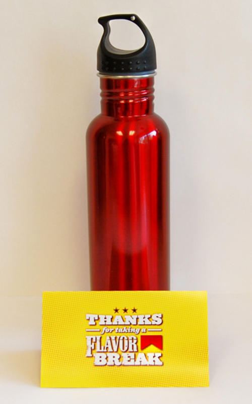 Red colored canteen (bottle) gift, send by direct mail from Marlboro. Gift was offered and redeemed from the brand's website, www.marlboro.com. Piece included a card thanking the receiver for "taking a flavor break", and encouraging them to visit the website for "flavor, rewards and more."