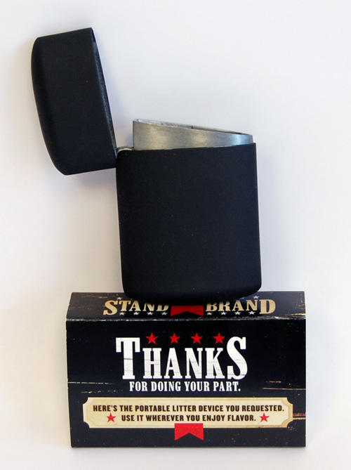 Black portable litter device, send by direct mail from Marlboro. Gift was offered and redeemed from the brand's website, www.marlboro.com. Text: "Thanks for doing your part. Here's the portable litter device you requested. Use it wherever you enjoy flavor"