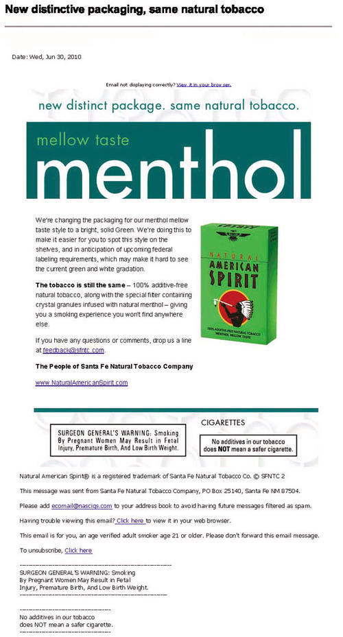 E-mail from Natural American Spirit announcing to smokers that the brand is changing the packaging of its menthol mellow style to a bright solid green, in order to make it easier to spot on shelves and "in anticipation of of upcoming federal labeling requirements, which may make it hard to see the current green and white gradation." However, the email assures customers that the tobacco in the pack will stay the same.