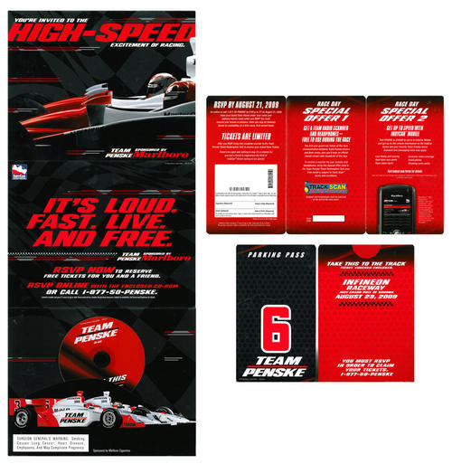 Direct mail from Marlboro in promotion of Marlboro's racing sponsorship of Team Penske. Piece includes on offer free tickets ("for you and a friend") to a racing event on August 23rd, 2009 (Indy Grand Prix of Sonoma, California). Piece includes a cd with more information, a voucher, and parking pass.