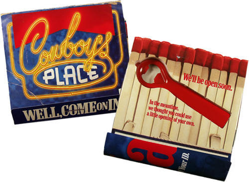 Direct mail from Marlboro promoting the "Cowboy's Place" campaign. The package is designed to resemble a match book, and includes a free gift - a red bottle opener. The mailing also includes a request that the receiver send in a copy of a government issue ID to verify that only smokers 21 years of age or older participate in Marlboro mailings. Once received, the smoker will be mailed a free lighter.