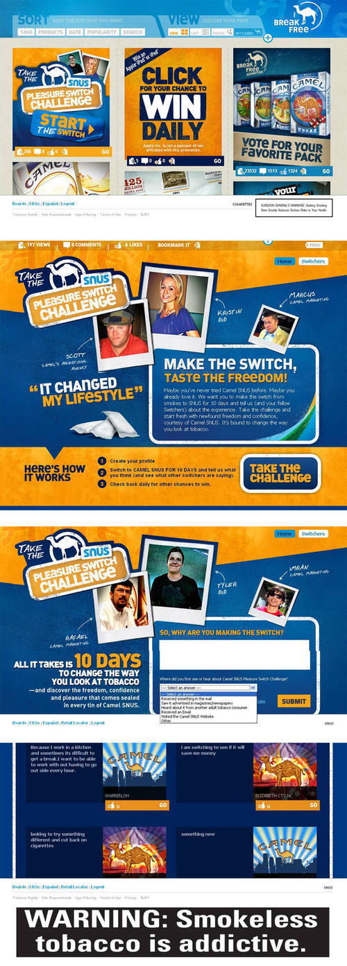 Web pages recorded from Camel.com and Camelsnus.com on December 15, 2010 promoting the "Snus Pleasure Switch Challenge." The "challenge" asks smokers to switch to Camel Snus for 10 days and then share about their experience. Images from top to bottom: