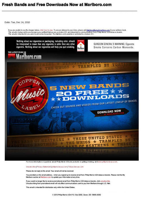 Email from Marlboro advertising free songs for downloading from five new bands featured on Marlboro.com. The bands are featured under Marlboro's Copper Music Label promotion.