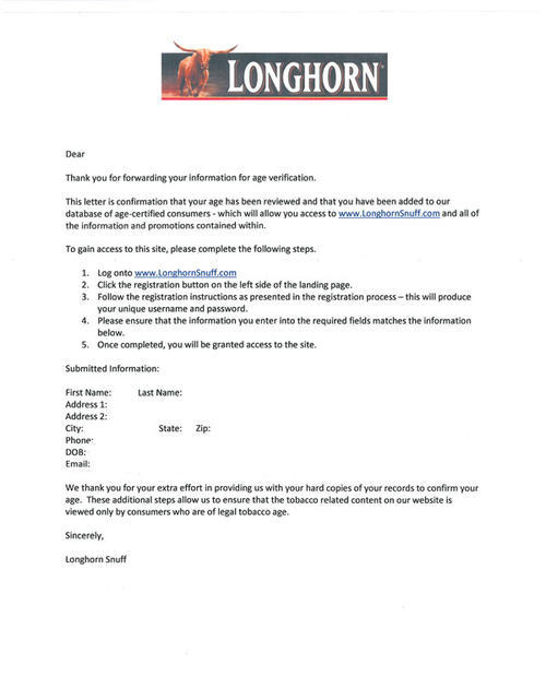 Direct mail letter from Longhorn thanking the receiver for their interest in the Longhorn website and confirming that the receiver has been age-verified. The letter directs the receiver to the website to complete registration and obtain access.