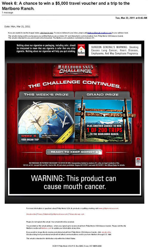 Email sent in March 2011 reminding the receiver to participate in Week 6 of the Marlboro Snus Challenge, a sweepstakes in which participants can answer weekly questions about Marlboro Snus for a chance to win a weekly prize or a period end grand prize to the Marlboro Ranch. Entry is based on responding to the questions in general, rather than on correct answers. The sweepstakes promotion officially began on February 14, 2011.