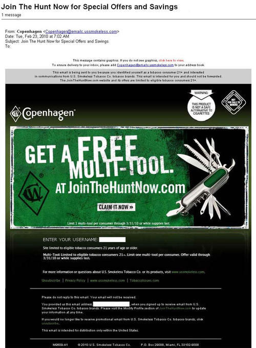 Black and green colored e-mail from Copenhagen received in February 2010 promoting an offer for a free multi-tool gift from the brand's website. "Get a free multi-tool at JoinTheHuntNow.com"