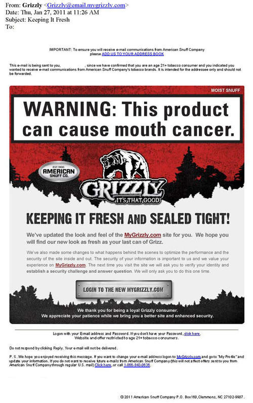 Email sent in late January 2011 announcing that the Grizzly website has been updated. Text: "We've updated the look and feel of the MyGrizzly.com site for you. We hope you will find out new look as fresh as your last can of Grizz."