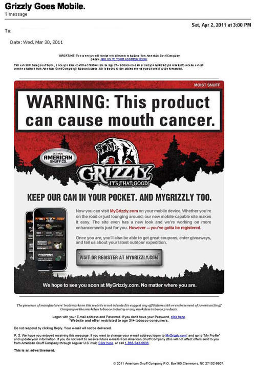 Email sent in late March 2011 announcing that Grizzly's brand website can now be viewed on mobile devices, such as cell phones.