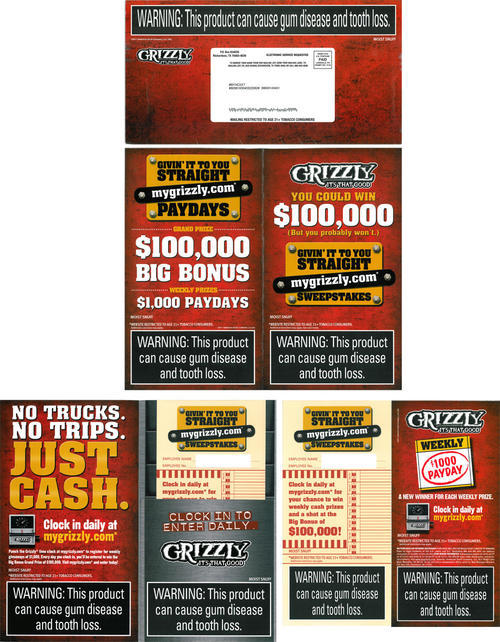 Direct mail from Grizzly received in late May promoting a new coming sweepstakes starting on June 13 - the "Givin' it to you straight" sweepstakes. Users can enter the sweepstakes daily during the promotional period on the brand's website (MyGrizzly.com) for a chance to win a weekly giveaway prize of $1000 or a grand prize of $100,000. The piece includes a time card to remind users to "clock in daily" and makes use of humor - e.g., "You could win $100,000 (but you probably won't).