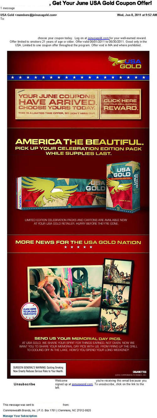 Email sent in June 2011 informing the receiver about a June coupon offer available from the brand's website and promoting limited edition "celebration" packs and cartons. The special red, white and blue American flag themed packs are timed to coincide with the July 4th holiday. The e-mail also invites receivers to submit and share their Memorial Day holiday pictures with the USA Gold website community.