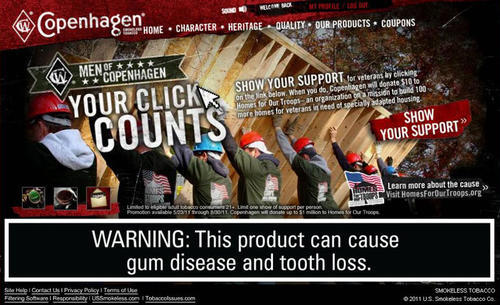 Web page from Copenhagen's brand website (freshcope.com) recorded in June 2011 asking site visitors to show their support for veterans by clicking on an included page link. The page indicates that by clicking on the link, Copenhagen will donate $10 to Homes for Our Troops, an organization dedicated to building homes for veterans in need of specially adapted housing.