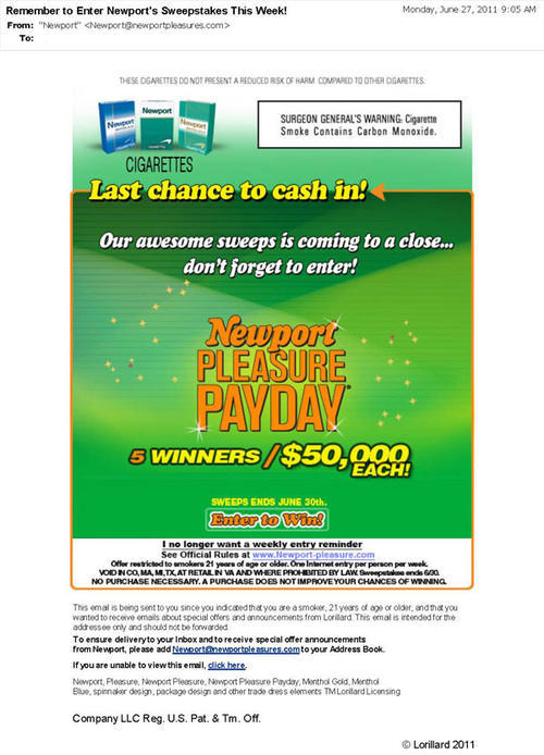 Email sent on June 27, 2011 reminding the receiver about their last chance to enter the 2011 Newport Pleasure Payday sweepstakes for a chance to win $50,000. "Last chance to cash in! Our awesome sweeps is coming to a close...don't forget to enter!"