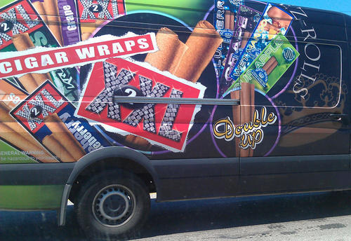 Image of cigar product distribution van with cigar wrap advertising. Van spotted driving around Columbus, Ohio, on June 29, 2011.