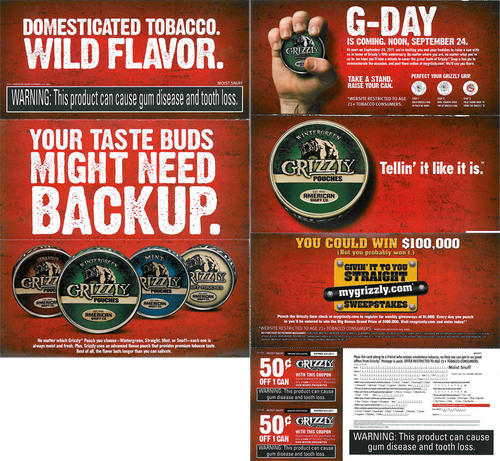 Grizzly direct mail received in June 2011 advertising the brand's different product styles and its current sweepstakes, the "Givin' it to you straight" sweepstakes. The piece also informs receivers about the coming of “G-Day”, that is, Grizzly’s 10 year anniversary, on September 24th. The mailing asks dippers to raise a can of Grizzly at noon on that day and to “snap a few pix to commemorate the occasion,” pictures they should later share on the brand’s website. Two product coupons and a sign up postcard to give to a friend are also included.