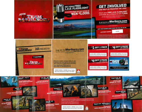 Direct mail advertising Team Marlboro, a land conservation related promotion and sweepstakes. Receivers are directed to the brand's website to learn about different conservation projects Marlboro has been involved in and to show support by clicking on a link on the website activating Marlboro to donate $5 towards conservation efforts in the country (up to $1 million).