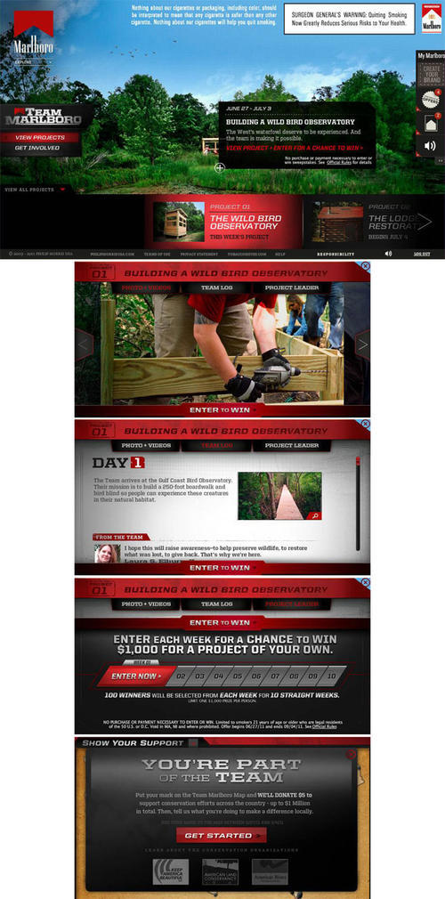 Web pages recorded in July 2011 from Marlboro.com showing a new section dedicated to Team Marlboro, a conservation themed promotion. Smokers can visit the site each of ten weeks to view pictures and learn details about ten different conservation projects Marlboro participants were involved in, and enter an associated weekly sweepstakes for a chance to win $1000 towards a project of their own. The website also invites smokers to “get involved” by clicking on a link activating Marlboro to donate $5 towards conservation efforts in the country (up to $1 million).