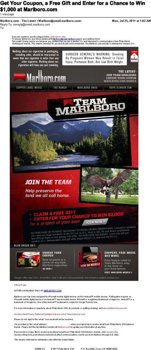 Email sent in July 2011 advertising Team Marlboro, a land conservation related promotion and sweepstakes. Receivers are directed to the brand's website to learn about different conservation projects Marlboro has been involved in and to show support by clicking on a link on the website activating Marlboro to donate $5 towards conservation efforts in the country (up to $1 million).