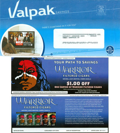 $1 off cWarrior filtered cigars, a Native American brand of cigars that comes in natural, light, menthol, cherry, and vanilla flavors.