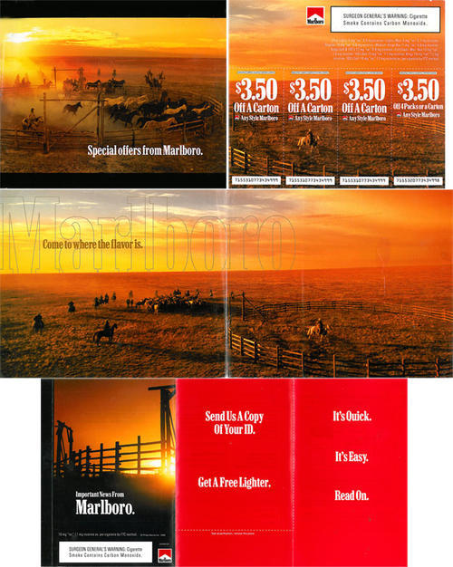 Direct mail providing the receiver with four cigarette coupons. The mailing also asks the receiver to mail in a copy of their driver's license for age verification purposes in exchange for a free lighter