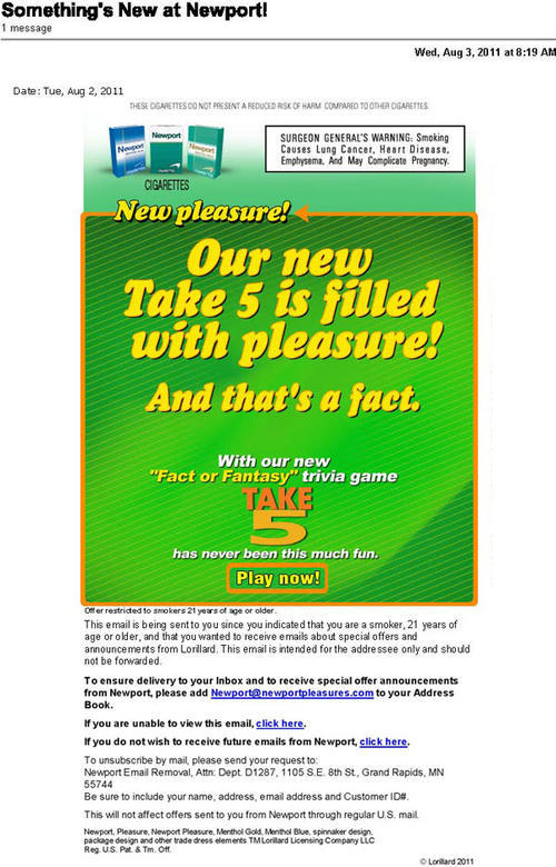 Email advertising a new interactive trivia game feature added to the brand's website. "Our new Take 5 is filled with pleasure! And that's a fact."
