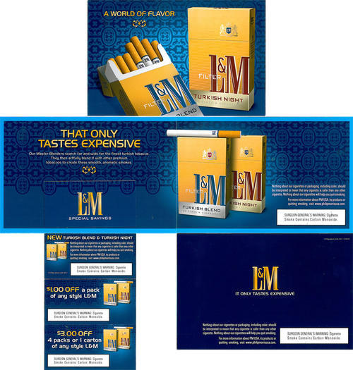 Direct mail in promotion of L&M brand Turkish Blend cigarettes. Text: "A world of flavor that only tastes expensive". Mailing includes two coupons.
