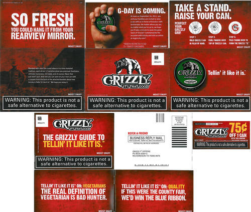 Direct mail from Grizzly received in August 2011 promoting the brand's freshness and overall premium quality. The mailing also includes a small booklet of irreverent and humorous Grizzly related quips, titled "The Grizzly Guide to Tellin' It Like It Is". The booklet includes a coupon for 75 cents off a can and a survey postcard to pass to a friend. The mailing also reminds receivers about the coming of "Grizzly Day" on September 24, 2011.