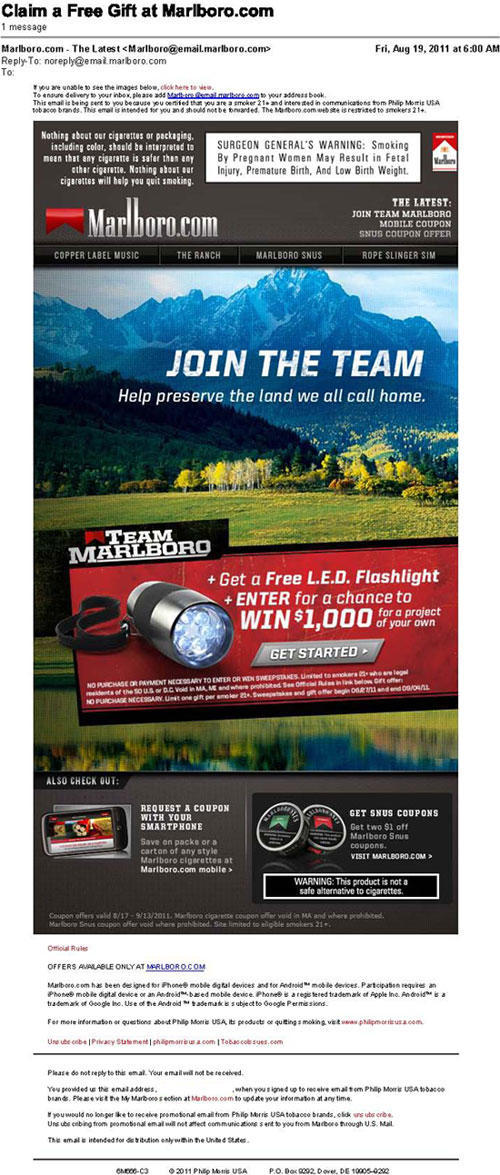 Email sent in August 2011 advertising Team Marlboro, a land conservation related promotion and sweepstakes. Receivers are directed to the brand's website to enter the sweepstakes and to claim a free gift - a L.E.D flashlight.