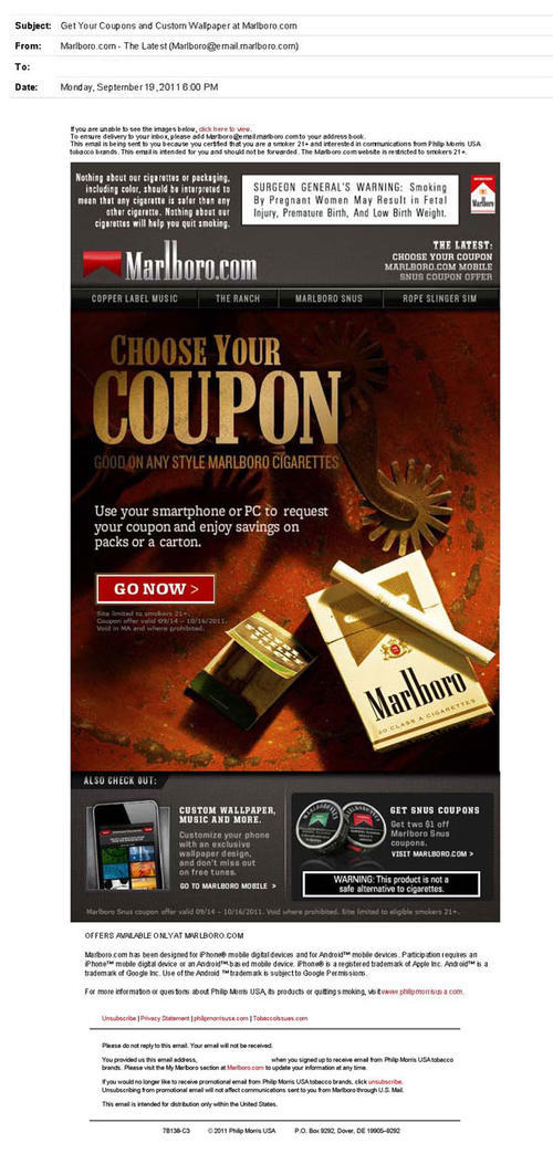 E-mail from Marlboro received in September 2011 advertising a new cigarette coupon offer available from the brand's website.